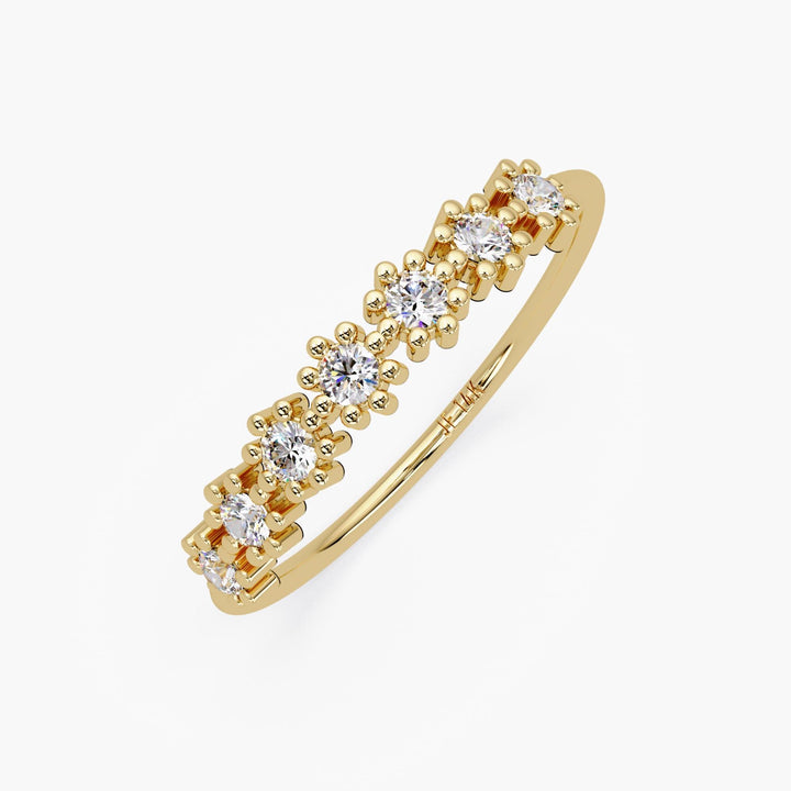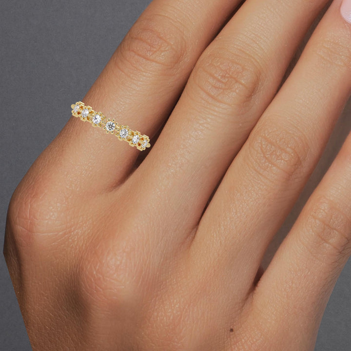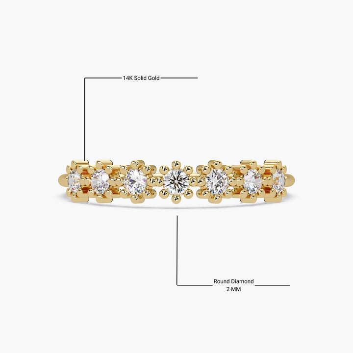 This dainty floral diamond band is handcrafted in 14K gold with lab-grown round diamonds set in a petal-inspired silhouette. Perfect as a minimalist wedding band, a stacking ring, or a nature-inspired gift she’ll treasure forever.